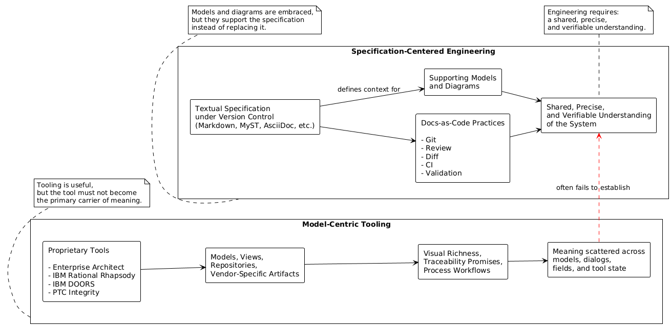 Specification-Centered Engineering is not a rejection of modeling, UML, SysML, or structured methods. It is a rebalancing — specifically a rejection of the pattern where a proprietary modeling tool becomes the epistemic authority of a system’s design.